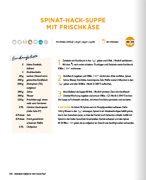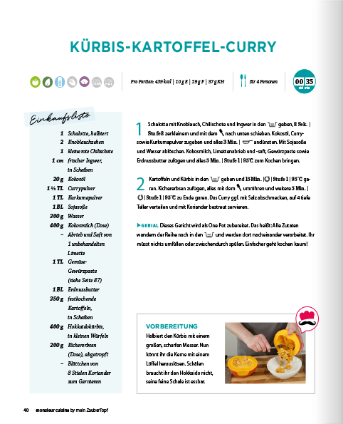 Erlebe mit der neuen Ausgabe monsieur cuisine by ZauberTopf und 82 köstlichen Rezepten den Herbst in deiner Küche. Wir zeigen dir, wie du die ganze Familie satt und glücklich machst, mit herzhaften Kürbisgerichten wie zart schmelzenden Kürbis-Mac-and-Cheese, würzigem Kürbis-Hack-Topf und mehr. Für ungemütliche Tage gibt es wärmendes Soulfood wie Burger, Falafel, Moussaka und Tiramisu. Süßen Genuss bereitest du dir und deinen Gästen mit den besten Obstkuchen für den Herbst – gebacken mit Äpfeln, Birnen, Zwetschgen und Holunderbeeren.