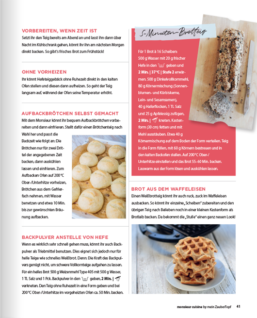In den praktischen Ratgebern findest du zudem viele konkrete Backtipps, wertvolle Checklisten und die wichtigsten Grundlagen zum Selberbacken ganz verständlich erläutert. So erfährst du Schritt für Schritt, wie du mit dem Monsieur Cuisine ab jetzt deine Lieblingsbrote einfach selbst backst. Wir verraten Tipps für köstliche Express-Brote, die sogar ohne Wartezeit gelingen und mit unserem großen Mehl-Check kannst du ab sofort alle Typen und Sorten unterscheiden. Werde auch du mit Monsieur Cuisine zum Back-Profi!
