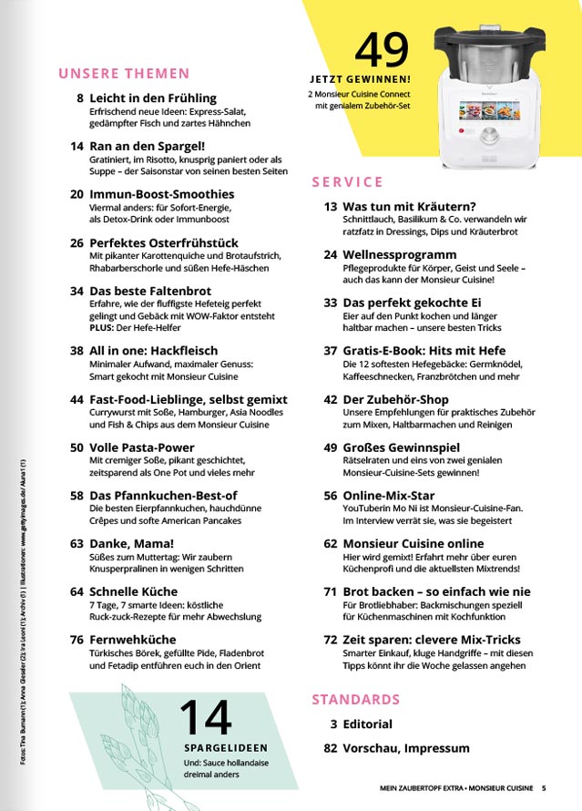 Das ZauberMix Extra speziell für den Monsieur Cuisine enthält Rezepte und Mix-Tricks für die Modelle Connect und Édition Plus. Das Premium-Magazin mit 84 Seiten, über 72 Rezepten und 78 Tipps bringt Spaß und Abwechslung in deine Küche!In dieser Ausgabe lernst du die Vorzüge und Möglichkeiten, die dir dein Küchenhelfer bietet noch besser kennen und wirst Schritt für Schritt zum Mix-Profi! Koche herrlich leichte Frühlingsgerichte mit frischem Gemüse, Hähnchen oder Lachs. Zaubere eines von sieben schnellen Mittagsgerichten und staune, wie einfach der Monsieur es dir macht! Außerdem dabei: grandiose Spargel-Ideen aus dem Mixtopf, mit denen du deine Lieben so richtig beeindrucken kannst, blitzschnell gemixte Smoothies, die deinen Körper im Nu auf Trab bringen, geniale All-in-One-Hackfleischgerichte und noch viel mehr! Das Beste: Alle Rezepte sind speziell an die Funktionen der Modelle Connect und Édition Plus angepasst. So kannst du mixen, kochen, braten, dämpfen und backen – einfach, gelingsicher und immer lecker! Mit dabei: wertvolle Tipps von unseren Mix-Experten, die dir praktische Handgriffe für deine Küchenmaschine von Lidl verraten. So geht’s noch schneller zum perfekten Ergebnis.