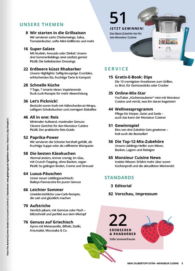 Auf regelmäßig über 80 Seiten Mixspaß zeigen wir dir, wie du blitzschnell leckeres Essen für dich und deine Liebsten zubereitet, wie du deine Gäste zum Staunen bringst oder anderen mit Leckerbissen aus der Küche eine Freue bereiten kannst. Wir zeigen dir, wie du die Funktionen deines Monsieur Cuisine voll ausschöpfst, so dass du im Umgang mit dem Küchenhelfer zum Profi wirst. So geht dir alles noch einfacher von der Hand. Das zukünftig zweimonatlich erscheinende Premium-Magazin liefert dir erprobte und gelingsichere Rezepte und geniales Know-how.