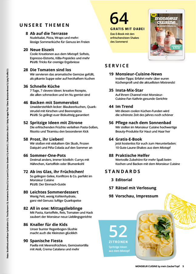 Auf regelmäßig über 80 Seiten Mixspaß zeigen wir dir, wie du blitzschnell leckeres Essen für dich und deine Liebsten zubereitet, wie du deine Gäste zum Staunen bringst oder anderen mit Leckerbissen aus der Küche eine Freue bereiten kannst. Wir zeigen dir, wie du die Funktionen deines Monsieur Cuisine voll ausschöpfst, so dass du im Umgang mit dem Küchenhelfer zum Profi wirst. So geht dir alles noch einfacher von der Hand. Das zukünftig zweimonatlich erscheinende Premium-Magazin liefert dir erprobte und gelingsichere Rezepte und geniales Know-how.
