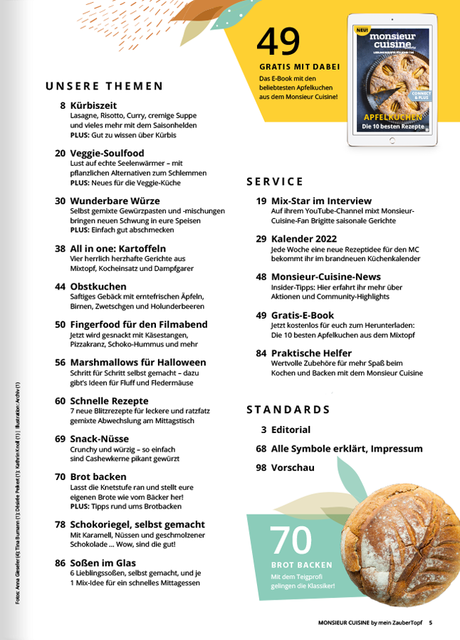 Erlebe mit der neuen Ausgabe monsieur cuisine by ZauberTopf und 82 köstlichen Rezepten den Herbst in deiner Küche. Wir zeigen dir, wie du die ganze Familie satt und glücklich machst, mit herzhaften Kürbisgerichten wie zart schmelzenden Kürbis-Mac-and-Cheese, würzigem Kürbis-Hack-Topf und mehr. Für ungemütliche Tage gibt es wärmendes Soulfood wie Burger, Falafel, Moussaka und Tiramisu. Süßen Genuss bereitest du dir und deinen Gästen mit den besten Obstkuchen für den Herbst – gebacken mit Äpfeln, Birnen, Zwetschgen und Holunderbeeren.