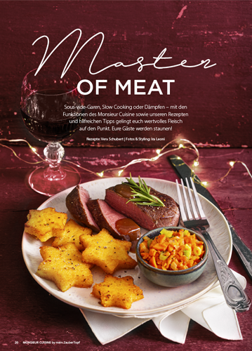 in diesem Jahr gehen wir die Weihnachtszeit gelassen an. Darum geht es doch letztlich auch, oder? Entspannen, sich nicht stressen lassen und es sich so richtig gemütlich machen. Wir finden, es muss nicht alles aufwendig sein, um zu begeistern – ganz im Gegenteil! Denn: Wenn wir als Gastgeber entspannt sind, werden es auch die Gäste sein. Unsere Ideen für mehr Ruhe im Alltag reichen von XXL-Gerichten vom Blech, die in wenigen Minuten im Ofen sind, über wunderbare Suppen, die günstig und einfach im Monsieur gekocht sind und dabei so viel für die Seele tun, bis hin zu deftigen Hackfleischgerichten, die bequem all in one zubereitet werden. Sogar unser Festmenü ist easy gemacht, sieht aber spektakulär aus – und das ist das Geheimnis. Ebenso clever: Das Silvesterbüfett mit Fondue-Brot zum schmelzenden Käse, der ebenfalls rasch im Mixtopf vorbereitet wird, bis zum Berliner ohne Frittieren – alle werden Staunen, wie du das gemacht hast!