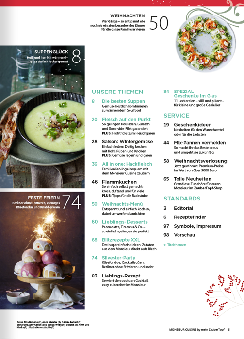 Der Monsieur Cuisine nimmt dir so viel Arbeit ab, dass du mit unseren einfachen Rezepten easy ein komplettes Vier-Gänge-Menü für die Festtage zubereiten kannst. Für die Weihnachtsvorbereitungen findest du im großen Spezial tolle Rezepte für süße und herzhafte Leckereien. Das Besondere: Sie kommen alle ins Glas und lassen sich so toll verschenken! Auch zu Silvester erleichtert dir der Monsieur Cuisine alle Vorbereitungen – neben Fondue-Brot vom Blech zu cremig schmelzendem Fondue gibts Berliner ohne Frittieren sowie knusprigen Knabberkram und mehr. Alle werden staunen, wie du das gemacht hast!